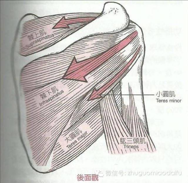 在肩关节外展的过程中冈下肌和小圆肌外旋肱骨至最恰当的位置避免肱骨大结节与肩峰相撞击。