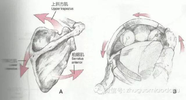 上斜方肌,下斜方肌和前锯肌共同作用使得肩胛骨外旋;肩胛提肌,菱形肌,背阔肌和胸小肌共同作用使得肩胛骨内旋。