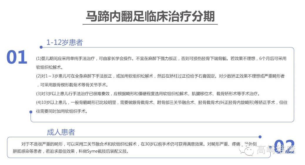 6.三关节融合术:适应征:10岁以上儿童;合并跖骨内收、后足内翻、跖屈三种畸形;可以考虑行此手术。